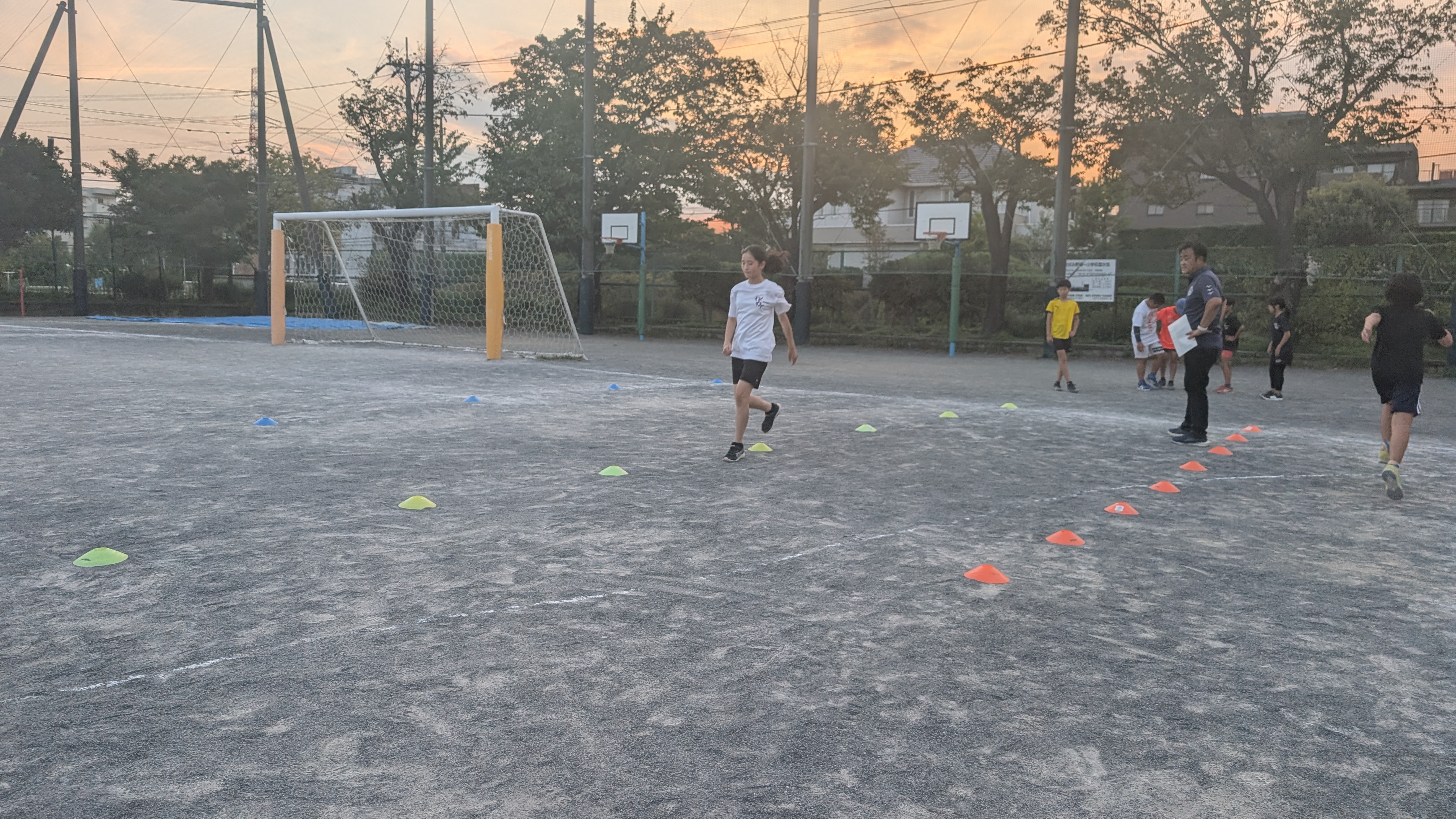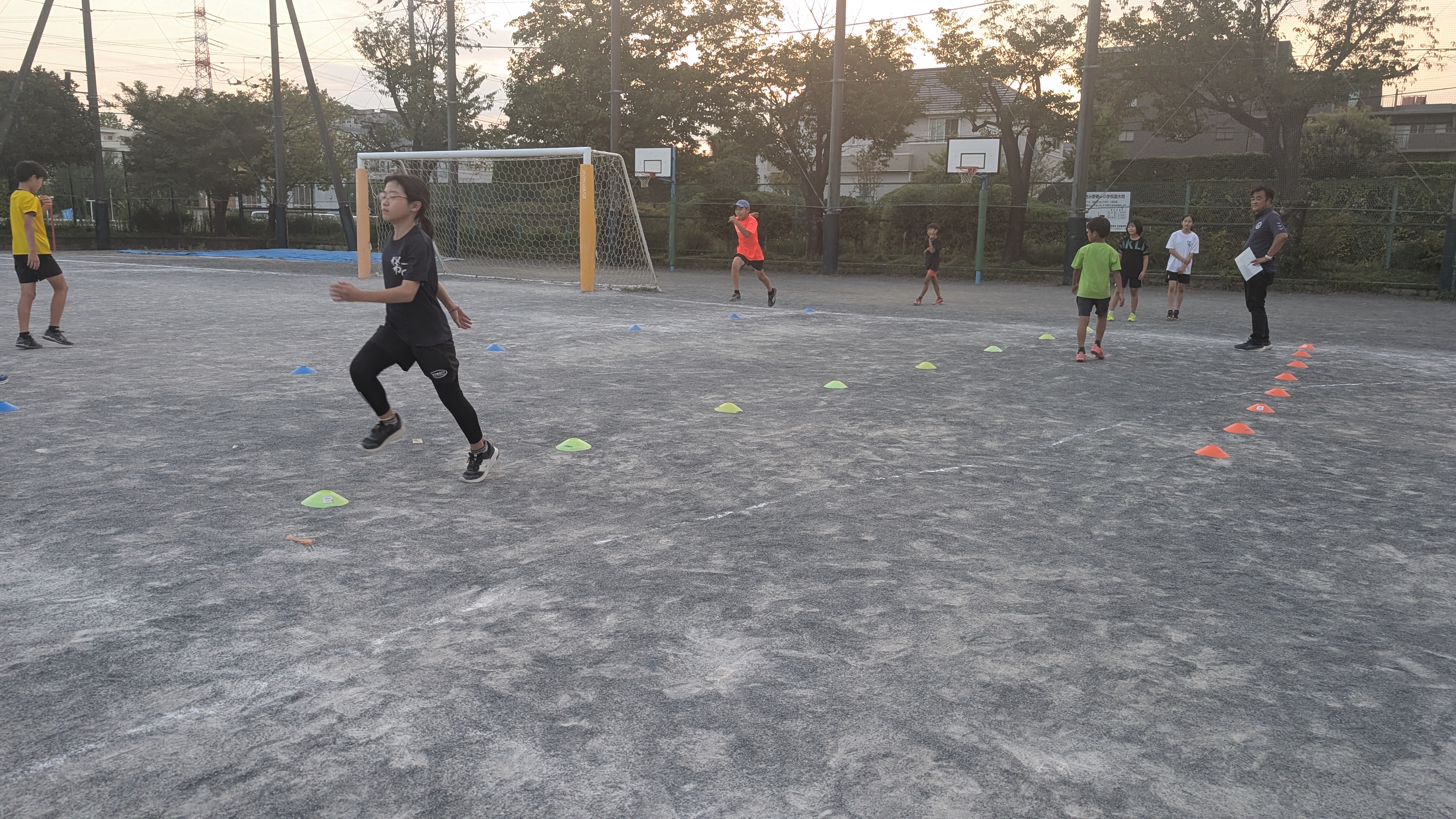 【陸上選手:あざみ野第一小;子供8】                                         ウォークドリルからブラジル体操をしました。少しずつ覚えて動きもできるようになってきています。後半はマーカーを使って弾みながら反発の感覚も意識しました。