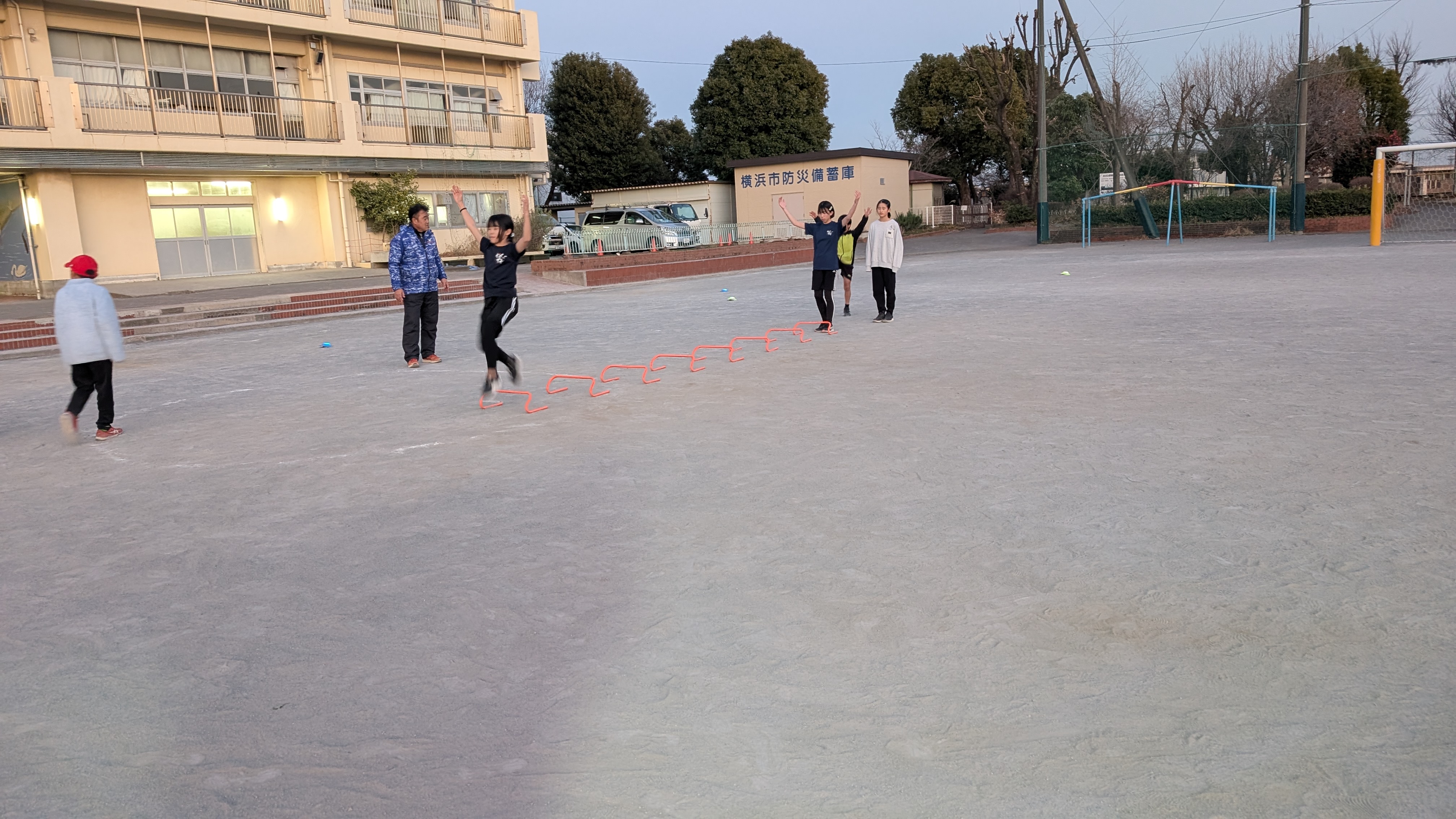 マットを用いて身体をほぐしたり刺激を入れたあと、ミニハードル。姿勢や腕振りを意識しました。そのあとは7リターンズを計測しましたが、ターンすることがなかなか難しく苦戦していました。