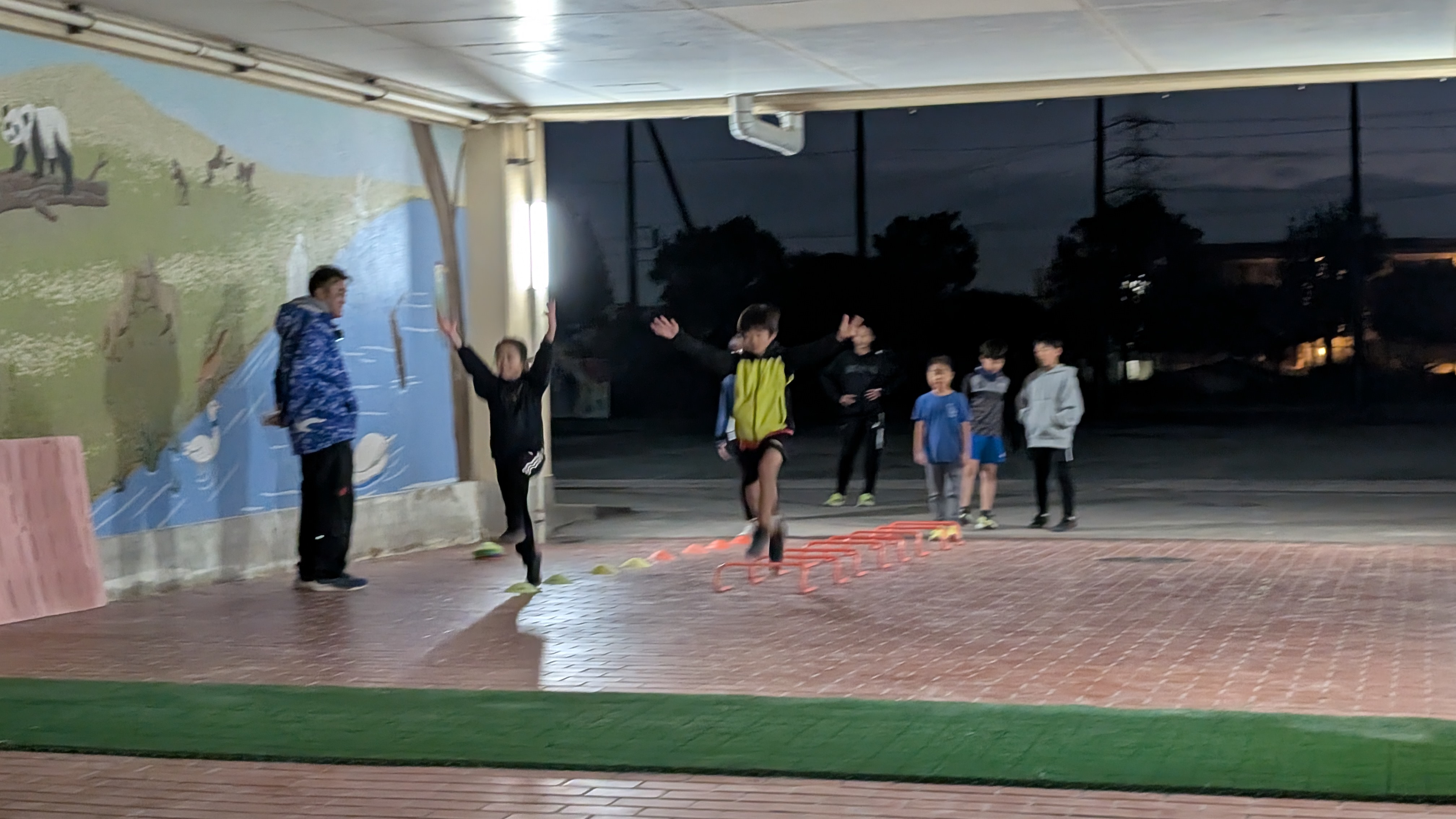 【陸上選手:あざみ野第一小;子供10】                                                    ウォークドリル、ブラジル体操をみんなで行い、その後は50mを10秒で走り、10秒休憩してまた走ることを10回繰り返すことをしました。その後はピロティでミニハードルや補強を行いました。成長した中学生を見て小学生も憧れの眼差しでした。